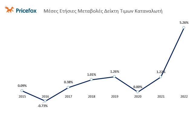 Με έτος βάσης για την σύγκριση τιμών το 2020, χρονιά με μειωμένες τιμές και μειωμένο δείκτη τιμών καταναλωτή, παρατηρείται ραγδαία αύξηση τον Φεβρουάριο του 2022 ορμώμενη από την έκρηξη των τιμών σε ενέργεια, καύσιμα και βασικά καταναλωτικά αγαθά.