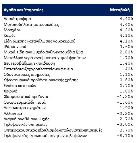 Στους παρακάτω πίνακες παρουσιάζονται οι μεταβολές των τιμών τον Φεβρουάριο του 2022 σε σύγκριση με τον Φεβρουάριο του 2021.