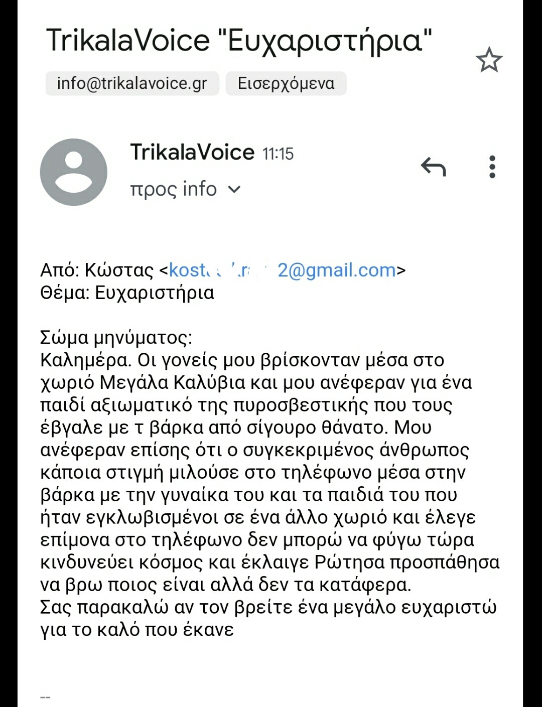 Κοινωνός μιας συγκλονιστικής ιστορίας έγινε τις μέρες της μεγάλης πλημμύρας το trikalavoice.gr. Άνθρωπος που ζει μακριά από τα Τρίκαλα αγωνιούσε για τους ηλικιωμένους γονείς του που βρέθηκαν εγκλωβισμένοι στα Μεγάλα Καλύβια.