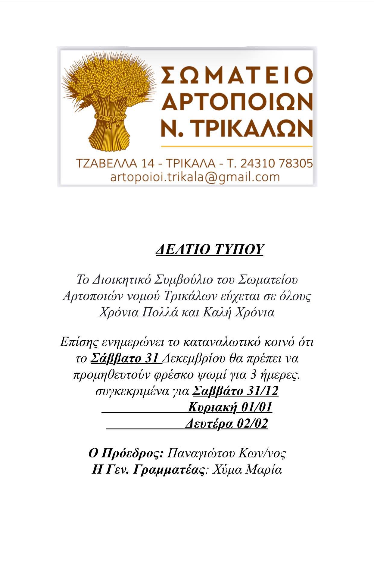 Κλειστά θα παραμείνουν τα αρτοποιεία των Τρικάλων τη Δευτέρα 2 Ιανουαρίου. Έτσι το Σάββατο θα πρέπει να προμηθευτούμε ψωμί για τρεις ημέρες.