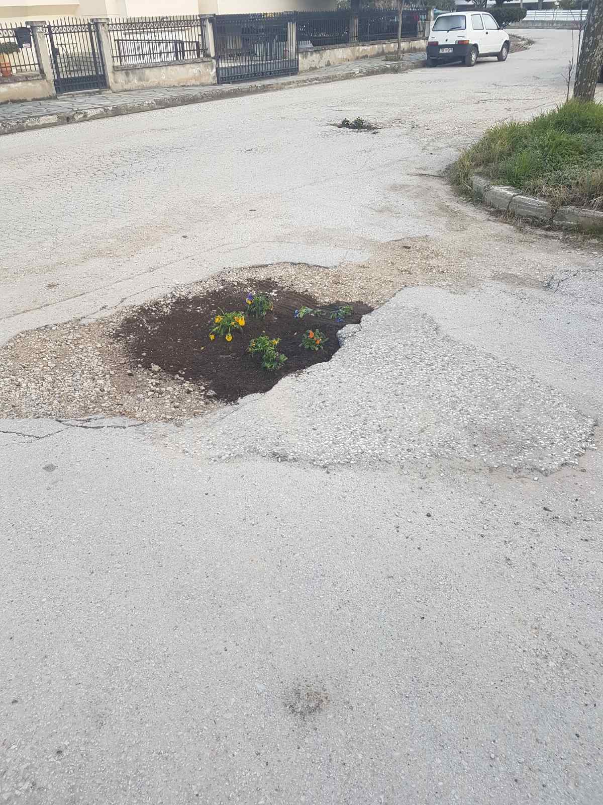 Έτσι μην παραξενευτείτε αν οδηγώντας στην περιοχή δείτε ξαφνικά στη μέση του δρόμου… όμορφα λουλούδια. Τα φύτεψαν οι κάτοικοι, δίνοντας τουλάχιστον στις λακκούβες μια άλλη χάρη. Δείτε τις χαρακτηριστικές φωτογραφίες του trikalavoice.gr: