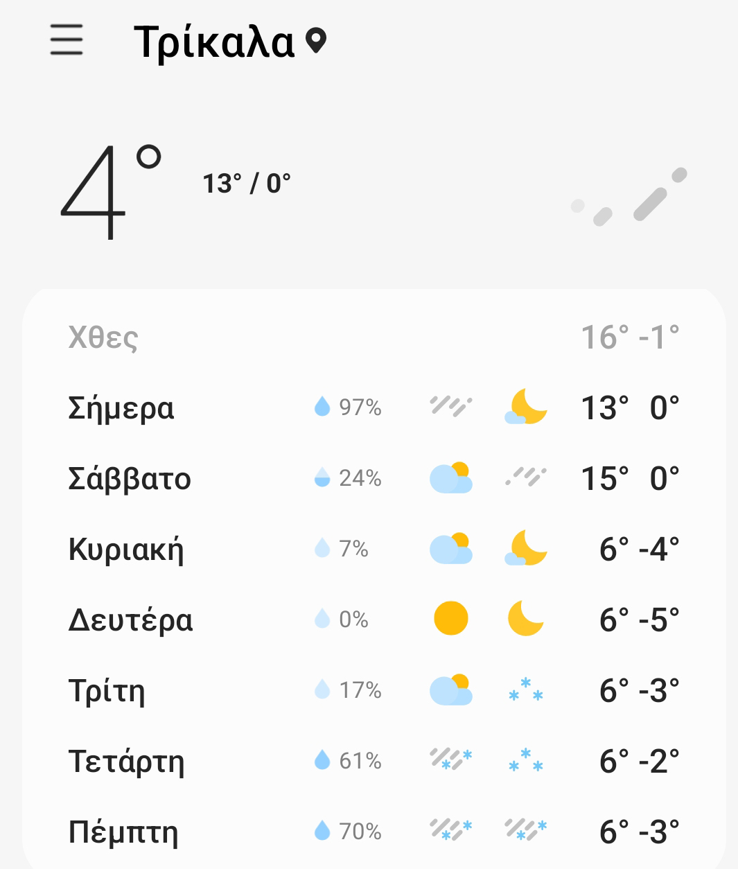 Ωστόσο και σύμφωνα με τα σημερινά δεδομένα την ερχόμενη εβδομάδα προβλέπονται χιονοπτώσεις στην περιοχή μας, κατά τόπους έντονες, ενώ τα προγνωστικά μοντέλα δίνουν χιόνι ακόμη και μέσα στην πόλη των Τρικάλων από την Τρίτη και μετά. Δείτε το σχετικό διάγραμμα:
