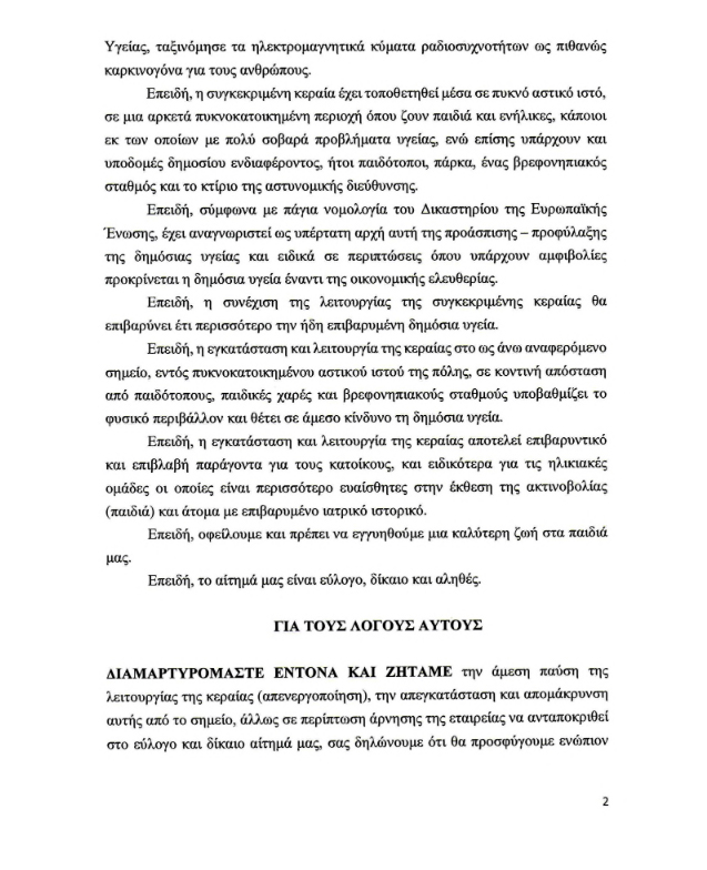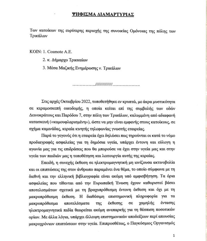 Ψήφισμα διαμαρτυρίας των κατοίκων της “Ομόνοιας” για την εγκατάσταση κεραίας κινητής τηλεφωνίας στον οικισμό τους.