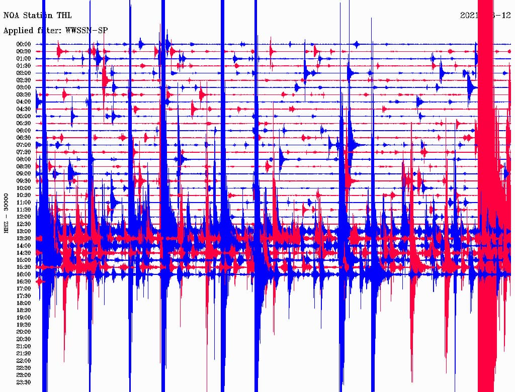 Ωστόσο όπως αναφέρει ο διευθυντής του Γεωδυναμικού Ινστιτούτου Αθηνών Γεράσιμος Χουλιάρας “είναι απολύτως φυσιολογικές οι εναλλασσόμενες εξάρσεις και ησυχίες κατα τη διάρκεια της μετασεισμικής περιόδου και αυτό φαίνεται στον σεισμογράφο που παρακολουθεί την σημερινή μικροέξαρση με τον μετασεισμό των 5 Ρίχτερ”. Δείτε παρακάτω τι αποτυπώνει ο σεισμογράφος από το μεσημέρι: