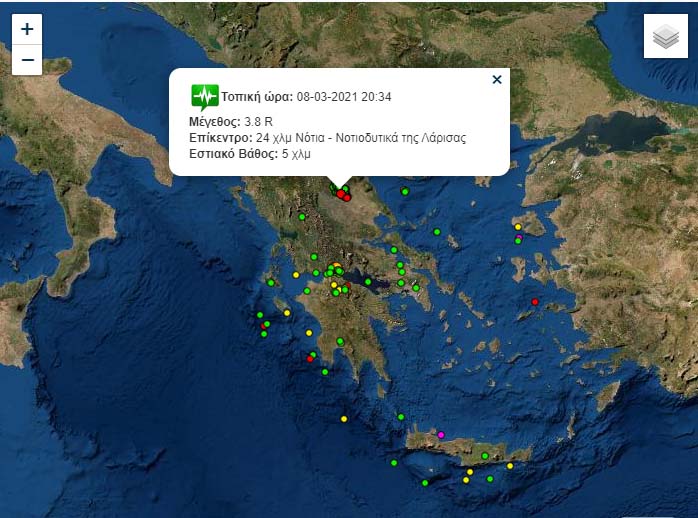 Ο πρώτος σημειώθηκε στις 20.00 ακριβώς 16 χιλιόμετρα Δυτικά της Λάρισας, προς το σημείο που παρατηρείται έντονη σεισμική δραστηριότητα τις τελευταίες μέρες και ο δεύτερος 3,7 Ρίχτερ στις 20.07.