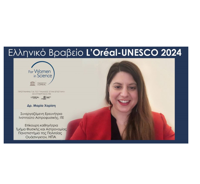 Στη Δρ. Μαρία Χαρίση, συνεργαζόμενη ερευνήτρια στο Ινστιτούτο Αστροφυσικής του Ιδρύματος Τεχνολογίας και Έρευνας (ΙΤΕ) και Επίκουρη Καθηγήτρια στο Πανεπιστήμιο της Πολιτείας Ουάσινγκτον των ΗΠΑ, απονεμήθηκε το Ελληνικό Βραβείο 2024 L’ORÉAL-UNESCO για τις Γυναίκες στην Επιστήμη, στον κλάδο των Φυσικών Επιστημών.