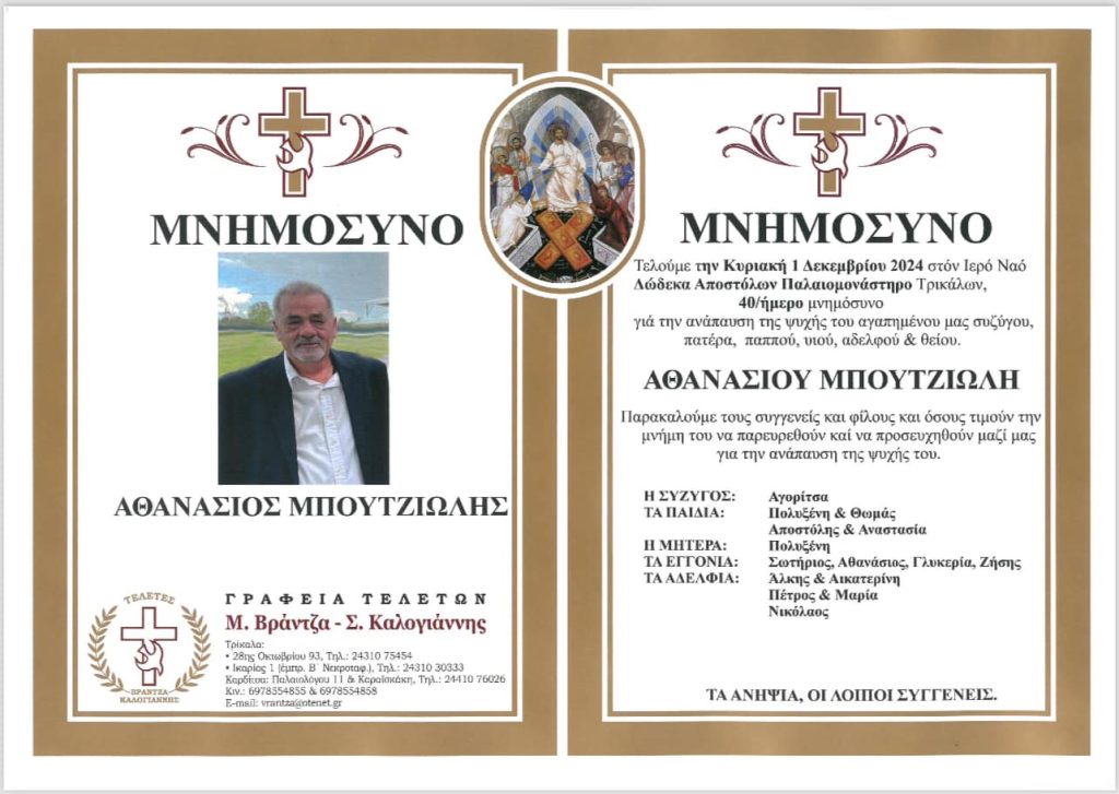 Την Κυριακή το πρωί 1η Δεκεμβρίου θα τελεστεί στον Ι.Ν. Αγίων Αποστόλων Παλαιομονάστηρου το τεσσαρακονθήμερο μνημόσυνο του Θανάση Μπουτζιώλη.