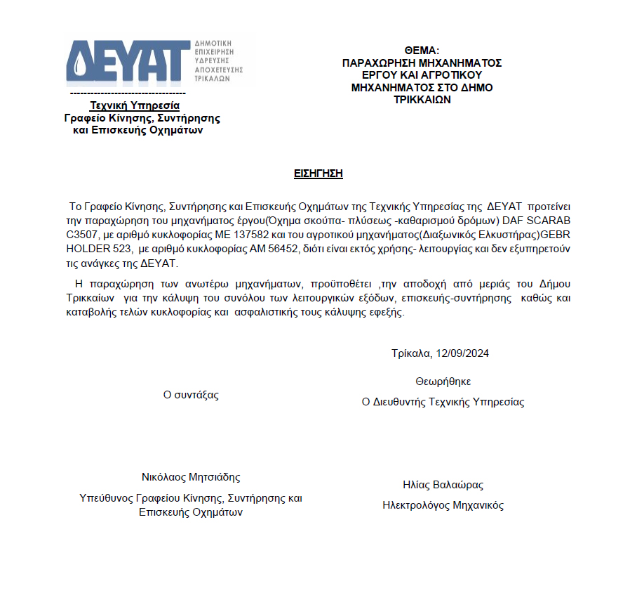 Έτσι και όπως καταγράφει το trikalavoice.gr με εισήγηση του προέδρου της Χρήστου Μπλουγούρα το όχημα παραχωρείται στον Δήμο Τρικκαίων… αφιλοκερδώς, ενώ δίνεται ως δώρο και ένα άλλο παροπλισμένο αγροτικό όχημα της ΔΕΥΑΤ. Να δούμε τι θα τα κάνει ο Δήμος τώρα. Ιδού η σχετική απόφαση: