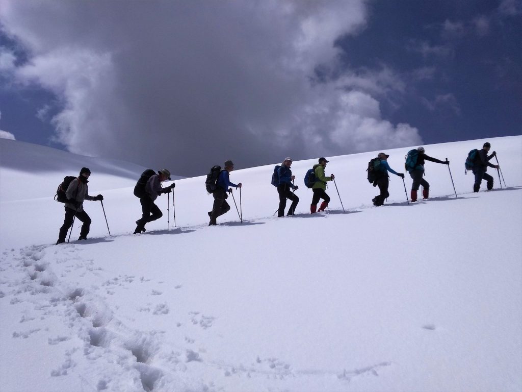 Φυσικά είναι νωρίς ακόμα για τσομπάνη και τσομπανόσκυλα. Το άφθονο φετινό χιόνι κυριαρχεί από το μαντρί και πάνω, στην αρχή σε άριστη κατάσταση, αστραφτερό και συμπαγές απλώνεται περσικό χαλί κάτω από τα πόδια μας και μας ανεβάζει ως κυλιόμενη σκάλα προς την κορυφή. Αλλά η ζέστη θα χαλάσει την σκάλα, με το πέρασμα της ώρας τα πόδια χώνονται ως το γόνατα στο περσικό χαλί. Η κλίση μεγάλη αλλά και το πείσμα μας αντάξιο των προκλήσεων του Αυγού.