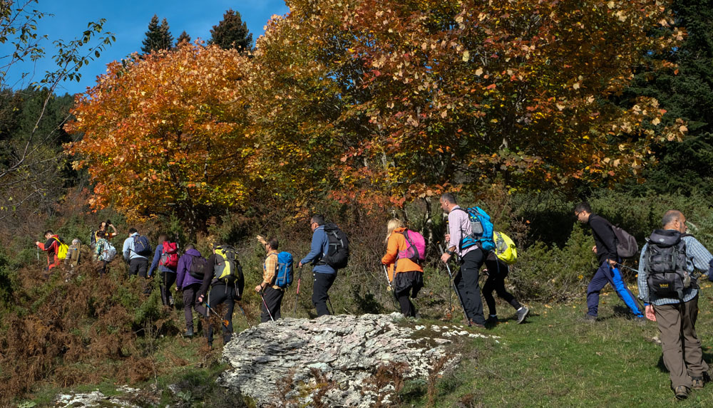 Μακρινή η κορυφή, αλλά ξεκάθαρη πλέον η πορεία μας. Κατά μήκος του χωματόδρομου, με μικρά ανεβοκατεβάσματα. Πότε μέσα από οξιές και πότε σε ξέφωτα, η πορεία μας είναι απολαυστική. Κυρίως είναι η παρουσία μοναχικών ξηροπλάτανων που αιχμαλωτίζει την προσοχή μας. Αυτό το εκπληκτικό είδος σφένδαμου (Acer obstusatum) δεν έχει καμία σχέση με τα πλατάνια. Είναι το χρώμα των φύλλων του που στην περίοδο του φθινοπώρου παίρνει όλη την χρωματική παλέτα του κίτρινου από το λεμονί μέχρι την ώχρα και το καφετί και στη συνέχεια περνά σε αυτή του κόκκινου. Κάθε φύλλο που πέφτει στο χώμα είναι και ένα εικαστικό αριστούργημα. Πρόκειται για το στολίδι του φθινοπώρου, ή μάλλον είναι η επιτομή του φθινοπώρου, ο βασικότερο λόγος για να φτάσεις μέχρι εδώ.