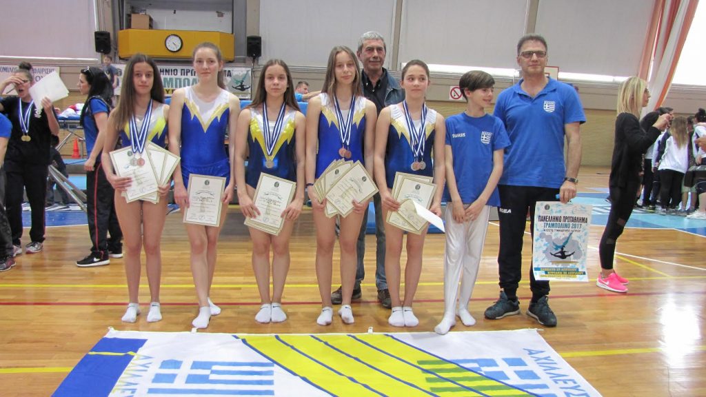 Με δυο ομαδικά μετάλλια επέστρεψε ο «ΑΧΙΛΛΕΥΣ» ΤΡΙΚΑΛΩΝ από τους Πανελλήνιους Αγώνες Τραμπολίνου που πραγματοποιήθηκαν στην Αθήνα στις 29 & 30 Απριλίου 2017. Αναλυτικότερα στην κατηγορία των κορασίδων οι αθλήτριες Κατσαρού Αριάδνη, Κοντούλη Μαρία, Κουρκούνη Δήμητρα και Ρομπιέ Άννα-Μαρία κατέκτησαν την Δεύτερη θέση στο ομαδικό στο αγώνισμα του Τραμπολίνο και την Τρίτη θέση στο αγώνισμα του Διπλού Μίνι Τραμπ. Αξιόλογη εμφάνιση έκαναν και η Χασιώτη Αναστασία όπου κατέλαβε την τέταρτη θέση στο Διπλό Μίνι Τραμπ στην κατηγορία των Νεανίδων και ο Σιακαβάρας Αθανάσιος την έκτη θέση στην κατηγορία των Παίδων. Ο Πρόεδρος Πήχος Βασίλειος πάντα κοντά στους αθλητές και τις αθλήτριες, τους συνεχάρη όλους και τον προπονητή Μέλλο Βασίλη και τους ευχήθηκε να συνεχίσουν ανάλογες επιτυχίες και στους επόμενους αγώνες. Η Αγωνιστική περίοδος συνεχίζεται με τους αγώνες Τραμπολίνου και Διπλού Μίνι Τραμπ στις μικρότερες κατηγορίες των Παγκορασίδων στις 20 & 21 Μαΐου στην Θεσσαλονίκη.