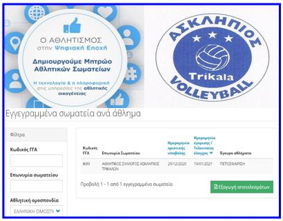 Στο Μητρώο Αθλητικών Σωματείων της ΓΓΑ είναι εδώ και λίγες μέρες ο Ασκληπιός Τρικάλων volley. Το Μητρώο που δημιουργήθηκε το τελευταίο διάστημα αποτελεί τον καθρέφτη των νόμιμων πλέον Σωματείων και περιλαμβάνει Αθλητικούς Συλλόγους απ΄ όλο το φάσμα του Αθλητισμού.