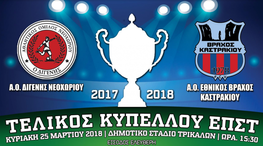 Την Κυριακή 25 Μαρτίου και ώρα 15.30 το μεσημέρι θα διεξαχθεί στο Δημοτικό Στάδιο Τρικάλων ο 44ος τελικός του κυπέλλου της ΕΠΣΤ με αντιπάλους τον κάτοχο του τίτλου Διγενή Νεοχωρίου και τον ΑΟ Βράχο Καστρακίου.