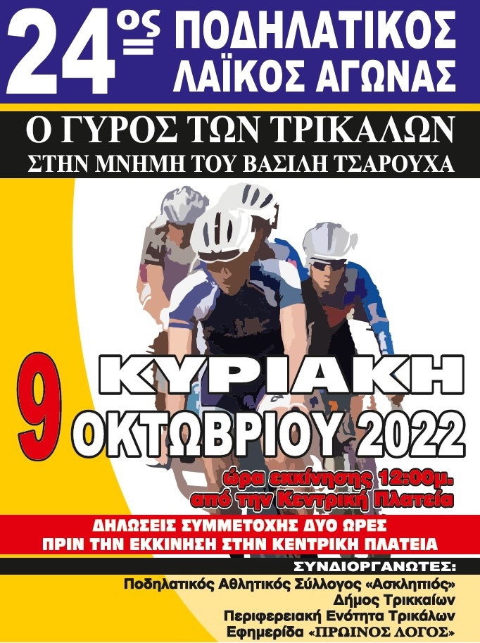Για 24η χρονιά – με τις παύσεις λόγω πανδημίας – «Ο Γύρος των Τρικάλων», ο μεγάλος λαϊκός ποδηλατικός αγώνας πραγματοποιείται στα Τρίκαλα την Κυριακή 9 Οκτωβρίου 2022. Ο ποδηλατικός σύλλογος «Ασκληπιός», ο Δήμος Τρικκαίων, η Π.Ε. Τρικάλων και η εφημερίδα «Πρωινός Λόγος συνδιοργανώνουν τον ποδηλατικό γύρο, στη μνήμη του Βασίλη Τσαρουχά.