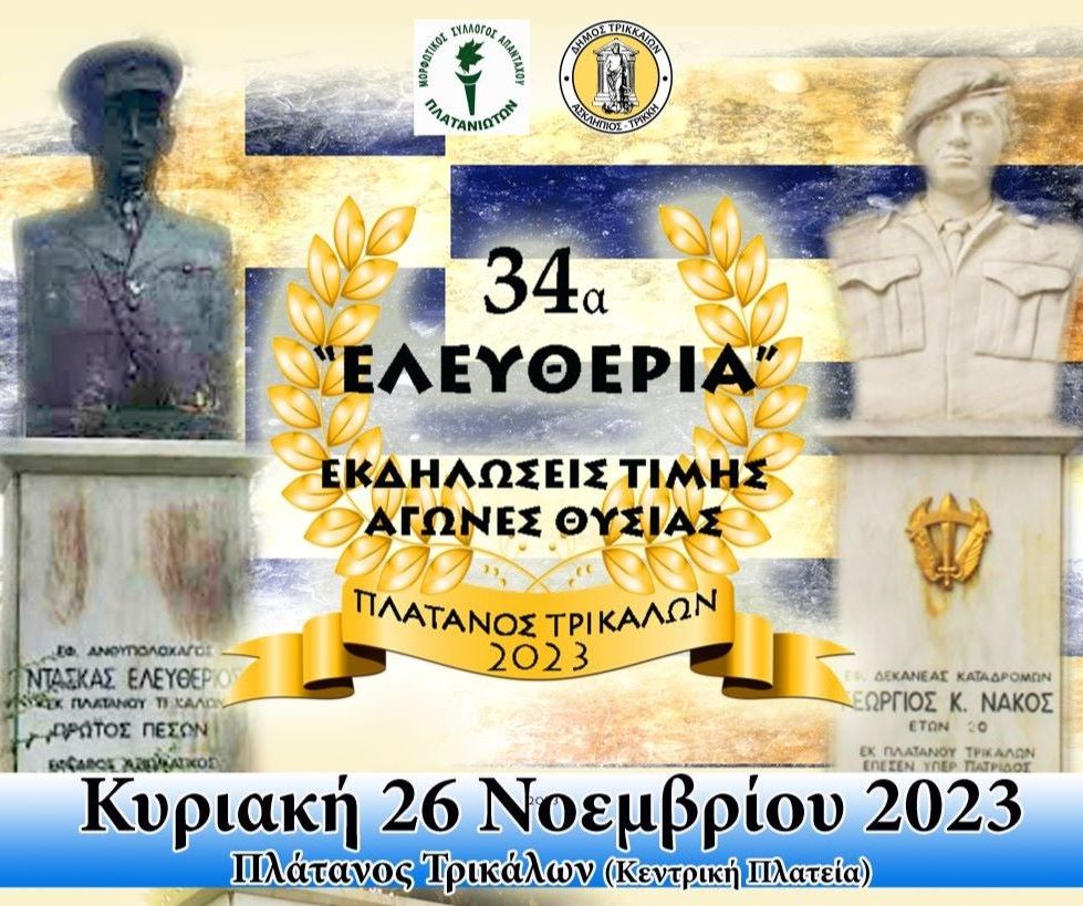 Τα 34α Ελευθέρια προς τιμή των Πλατανιωτών που έπεσαν για την πατρίδα, συνδιοργανώνουν ο Δήμος Τρικκαίων και ο Μορφωτικός Σύλλογος Απανταχού Πλατανιωτών. Με τη στήριξη της Κοινότητας Πλατάνου, του Γυμναστικού Συλλόγου Τρικάλων, της ειδικότητας Κλασικού Αθλητισμού του ΤΕΦΑΑ της ΣΕΦΑΑ του Πανεπιστημίου Θεσσαλίας και υπό την αιγίδα της ΠΕ Τρικάλων της Περιφέρειας Θεσσαλίας, η τιμητική αυτή εκδήλωση θα πραγματοποιηθεί την Κυριακή 26 Νοεμβρίου 2023, στο χωριό Πλάτανος του Δήμου Τρικκαίων.