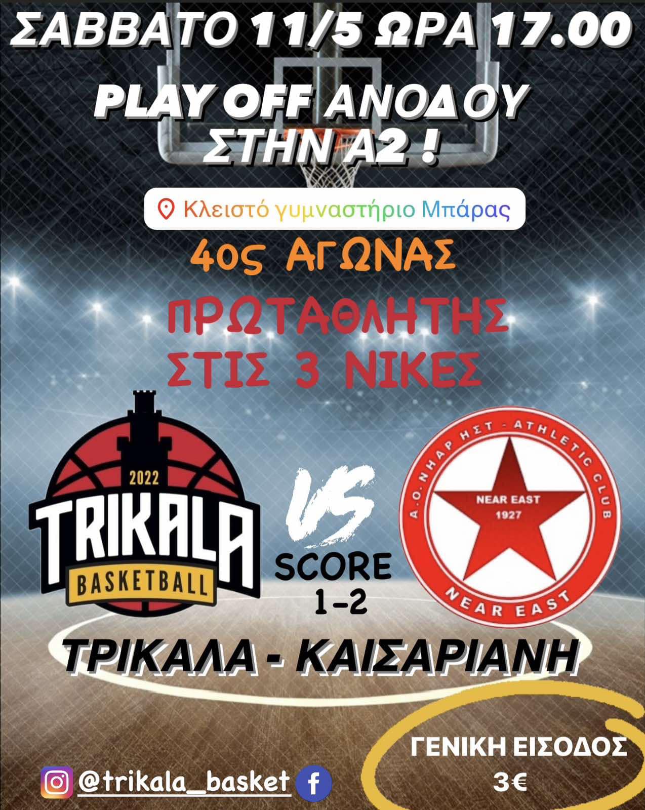 ΤΟΝ ΠΙΟ ΚΡΙΣΙΜΟ ΑΓΩΝΑ ΤΗΣ ΦΕΤΙΝΗΣ ΣΕΖΟΝ ΔΙΝΕΙ Η ΟΜΑΔΑ ΤΗΣ ΠΟΛΗΣ ΜΑΣ ΤΑ TRIKALA BASKET ΤΟ ΣΑΒΒΑΤΟ 11 ΜΑΪΟΥ ΚΑΙ ΩΡΑ 17:00 ΠΡΟΣΟΧΗ ΣΤΟ ΚΛΕΙΣΤΟ ΜΠΑΡΑΣ.