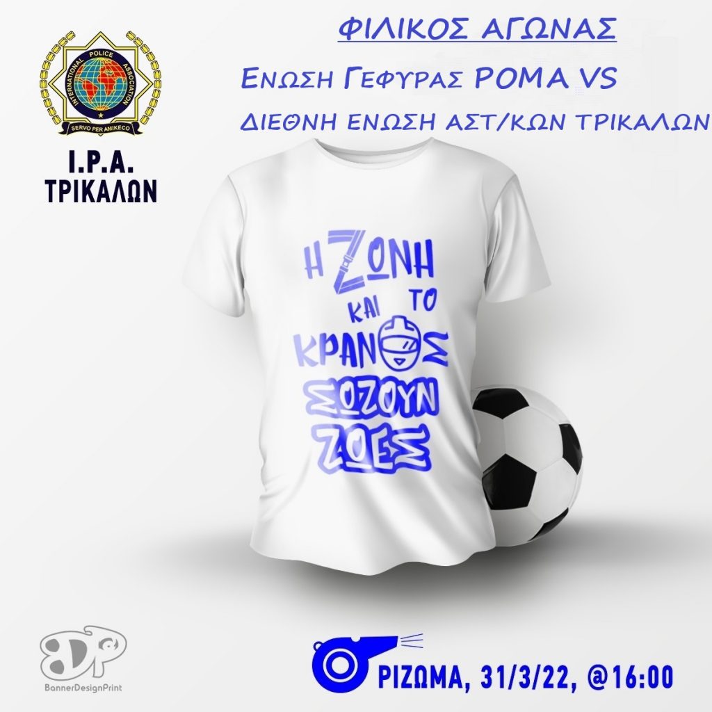 Η Τοπική Διοίκηση Τρικάλων της Διεθνούς Ένωσης Αστυνομικών στα πλαίσια της αστυνομικής διαμεσολάβησης στην κυκλοφοριακή παιδεία και την οδηγική συμπεριφορά, διοργανώνει φιλικό αγώνα ποδοσφαίρου μεταξύ της κοινότητας Ρομά Τρικάλων και Αστυνομικών με σκοπό την ενημέρωση και ευαισθητοποίηση των οδηγών για την πρόληψη και αποφυγή των τροχαίων ατυχημάτων.