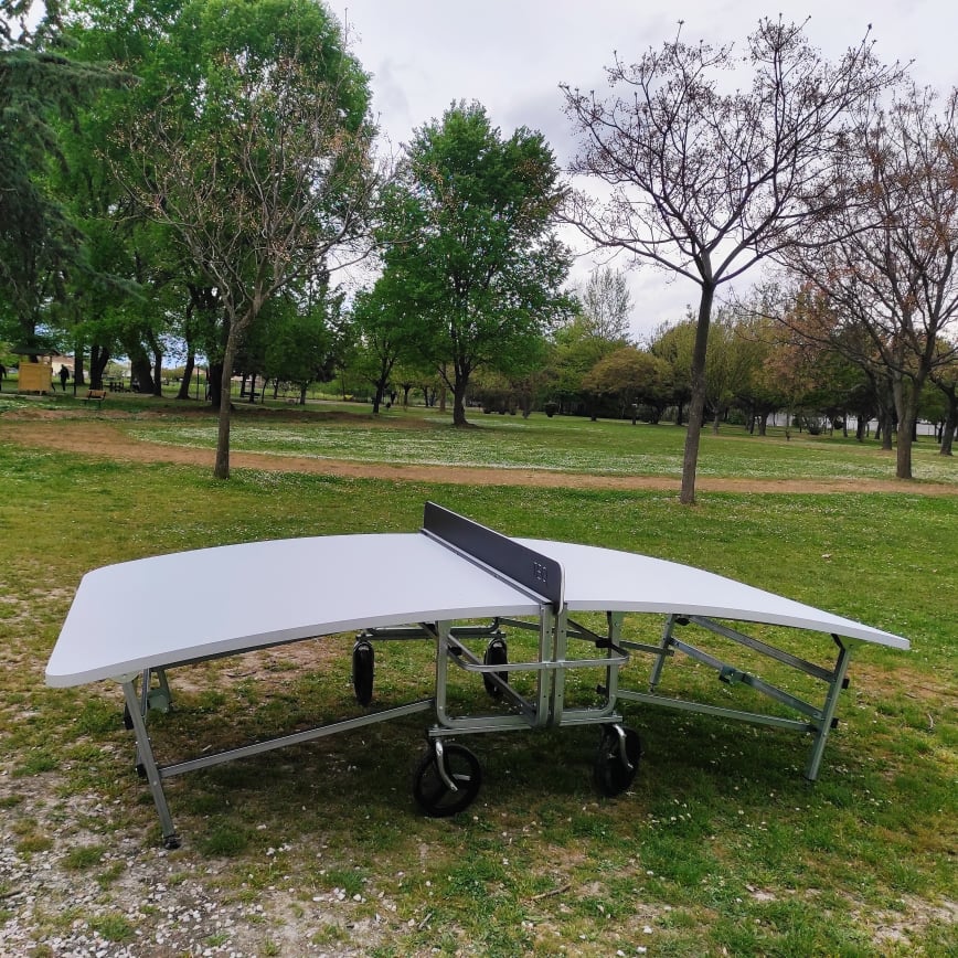 Η ειδική κλίση του τραπεζιού επιτρέπει στην μπάλα να πέφτει ακριβώς πίσω στον συμπαίκτη και να μη μένει στάσιμη στη μέση του τραπεζιού όπως θα συνέβαινε με ένα επίπεδο τραπέζι πινγκ πονγκ. Το τραπέζι έχει διαστάσεις 1,5Χ3 μέτρα και λόγω κατασκευής είναι ανθεκτικό σε όλες τις καιρικές συνθήκες και στην ηλιακή ακτινοβολία, επομένως είναι ιδανικό τόσο σε εσωτερικό όσο και σε εξωτερικό χώρο. Η βάση του επίσης μπορεί να βιδωθεί στο έδαφος.