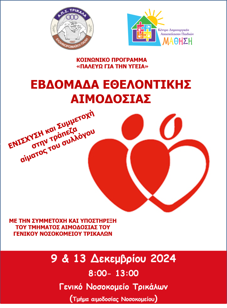 - Από την Δευτέρα 9/12/2024 έως και την Παρασκευή 13/12/2024 ο ΑΠΣ Τρίκαλα και τα ΚΔΑΠ ΜΑΘΗΣΗ συνδιοργανώνουν εθελοντική αιμοδοσία με στόχο την ενίσχυση της Τράπεζας αίματος του συλλόγου και πραγματοποιείται με τη συμμετοχή και υποστήριξη του τμήματος αιμοδοσίας του Γενικού Νοσοκομείου Τρικάλων.