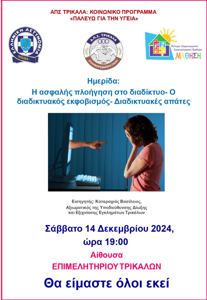 - Το Σάββατο 14/12/2024, ο ΑΠΣ Τρίκαλα, τα ΚΔΑΠ ΜΑΘΗΣΗ και η Ελληνική Αστυνομία συνδιοργανώνουν Ημερίδα με θέμα: Η ασφαλής πλοήγηση στο διαδίκτυο- Ο διαδικτυακός εκφοβισμός- Διαδικτυακές απάτες. Εισηγητής: Καταραχιάς Βασίλειος, Αξιωματικός της Υποδιεύθυνσης Δίωξης και Εξιχνίασης Εγκλημάτων Τρικάλων, στην Αίθουσα του Επιμελητήριου Τρικάλων, ώρα έναρξης 19:00.