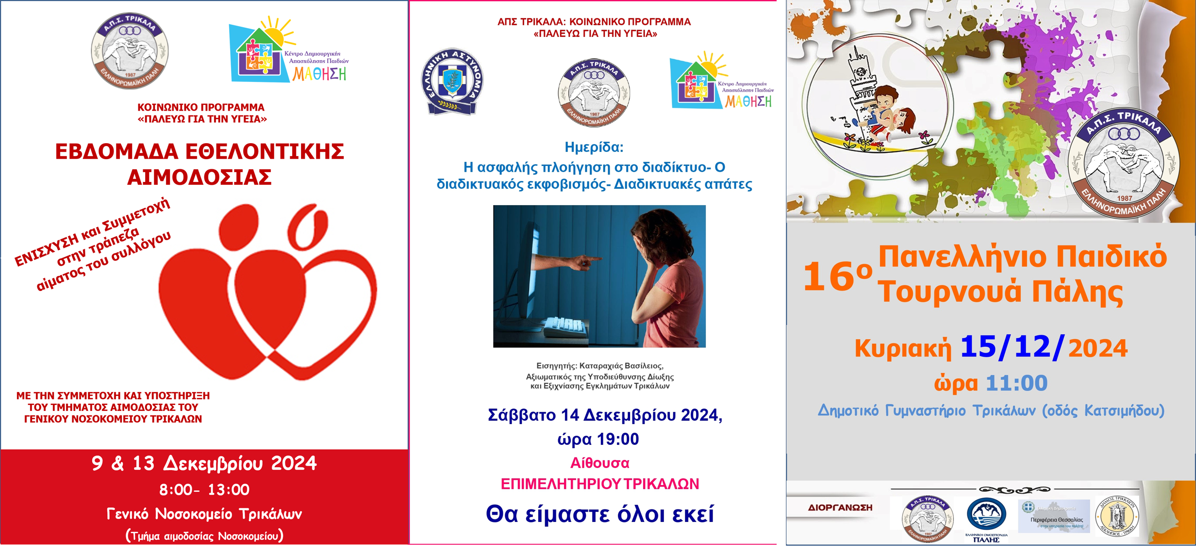- Το Σάββατο 14/12/2024, ο ΑΠΣ Τρίκαλα, τα ΚΔΑΠ ΜΑΘΗΣΗ και η Ελληνική Αστυνομία συνδιοργανώνουν Ημερίδα με θέμα: Η ασφαλής πλοήγηση στο διαδίκτυο- Ο διαδικτυακός εκφοβισμός- Διαδικτυακές απάτες. Εισηγητής: Καταραχιάς Βασίλειος, Αξιωματικός της Υποδιεύθυνσης Δίωξης και Εξιχνίασης Εγκλημάτων Τρικάλων, στην Αίθουσα του Επιμελητήριου Τρικάλων, ώρα έναρξης 19:00.