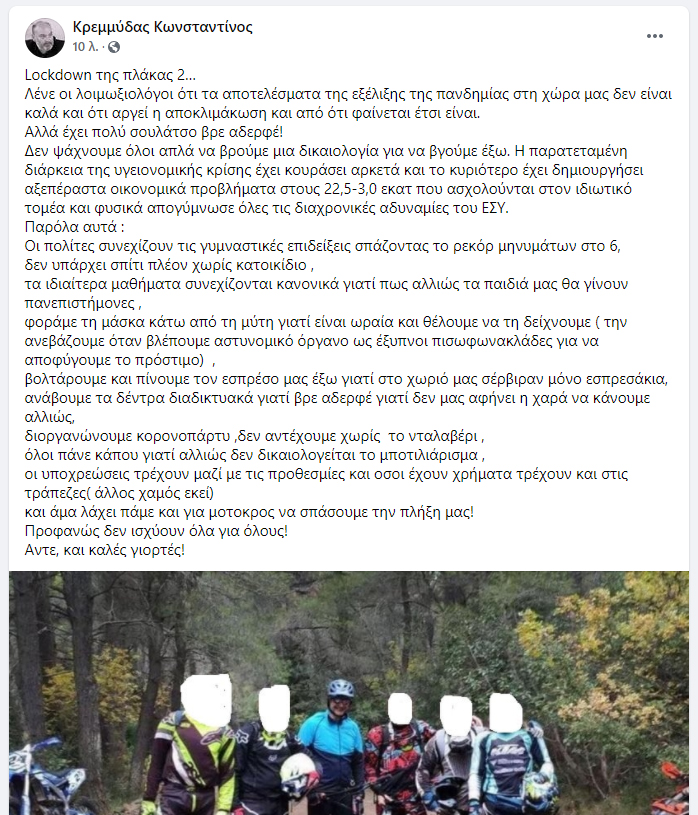 Του ‘χει κάνει καλό του Κωνσταντίνου του Κρεμμύδα η καραντίνα. Τις τελευταίες μέρες “πυροβολεί’ αδιακρίτως υπογραμμίζοντας τα κακώς κείμενα στην πόλη και όχι μόνο. Μετά τη σφοδρή κριτική στον Παπαστεργίου για την κοσμοσυρροή στη φωταγώγηση του Χριστουγεννιάτικου δέντρου περιέλαβε τον πρωθυπουργό Κυριάκο Μητσοτάκη. Δείτε χαρακτηριστική ανάρτησή του: