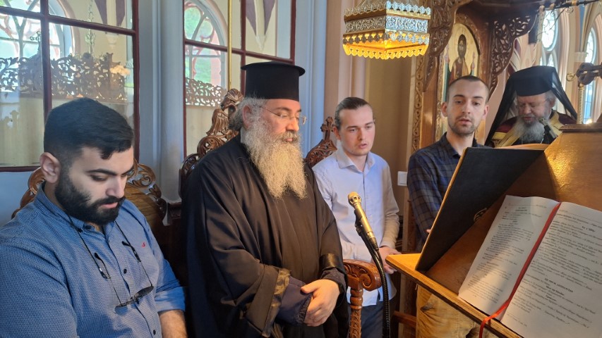 Τον χορό του δεξιού αναλογίου διηύθυνε ο προσελθών επί τούτο εκ Κύπρου Αιδεσιμολ. Πρωτοπρεσβύτερος κ. Δημήτριος Δημοσθένους, Προϊστάμενος του Καθεδρικού Ναού Αποστόλου Βαρνάβα Λευκωσίας. Έψαλαν, επίσης, ο Δρ. Γεώργιος Σιδηράς, ο κ. Μίλτος Σουλτάνης, ο Δρ. Ιωάννης Ρηγόπουλος, ο κ. Παναγιώτης Δημοσθένους και οι Δδες Ηλιάνα Αντωνίου και Ιωάννα Δημοσθένους.