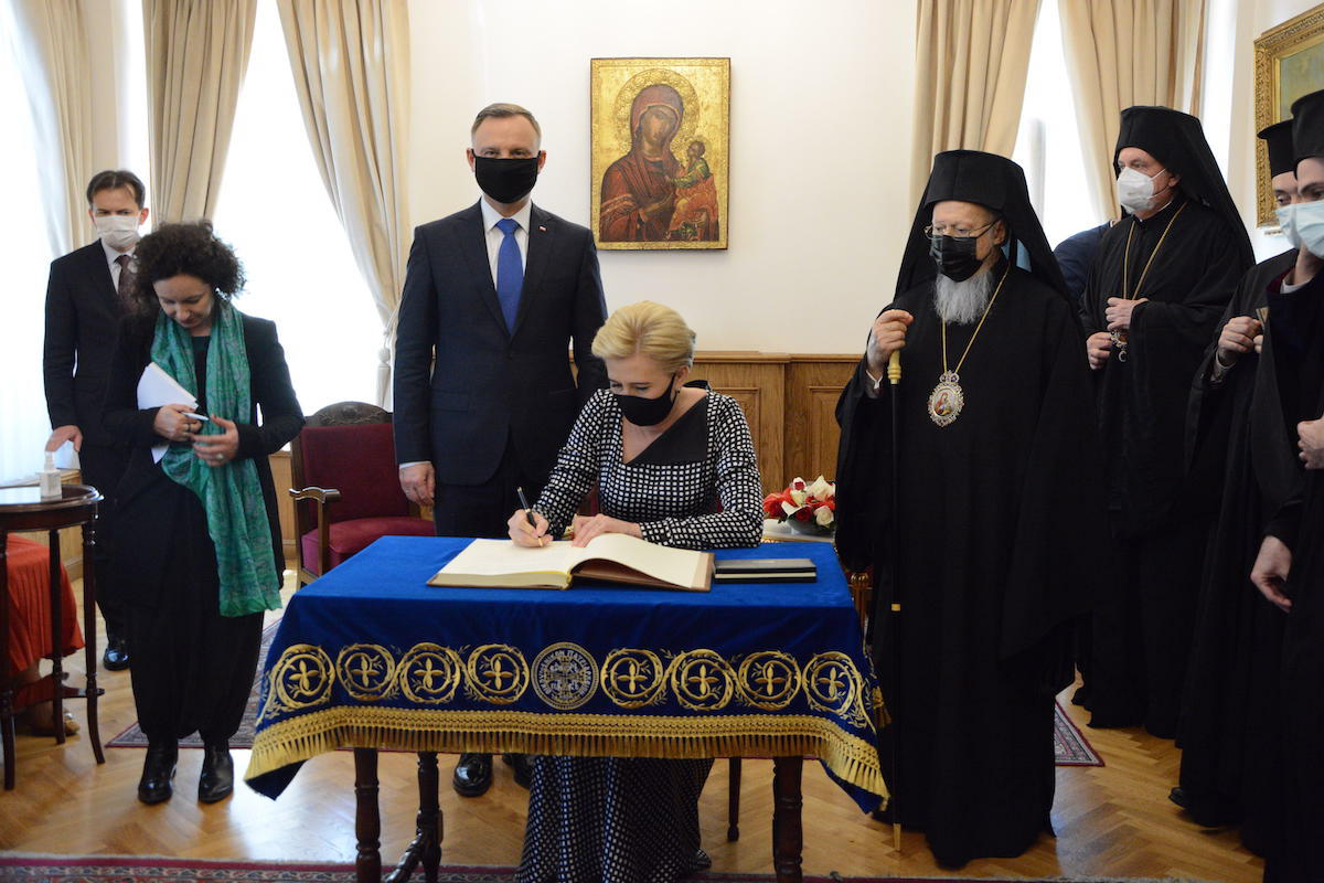 Ακολούθως, ο Πρόεδρος και η Πρώτη Κυρία της Πολωνίας υπέγραψαν στο βιβλίο των επισκεπτών του Πατριαρχείου, όπου, στο κείμενό τους, επισημαίνουν, μεταξύ άλλων, τη σημασία που έχει ο διαθρησκειακός διάλογος, ιδιαίτερα στο σύγχρονο κόσμο, για την ενότητα και την προώθηση της ειρήνης. Επίσης, δηλώνουν υπερήφανοι που η Ορθόδοξη Αυτοκέφαλη Εκκλησία της Πολωνίας είναι μία δραστήρια κοινότητα της χώρας τους που συμμετέχει στην κοινωνική ζωή και ζει με τις αρχές και τις αξίες που μαρτυρούν την παγκοσμιότητα του χριστιανισμού.
