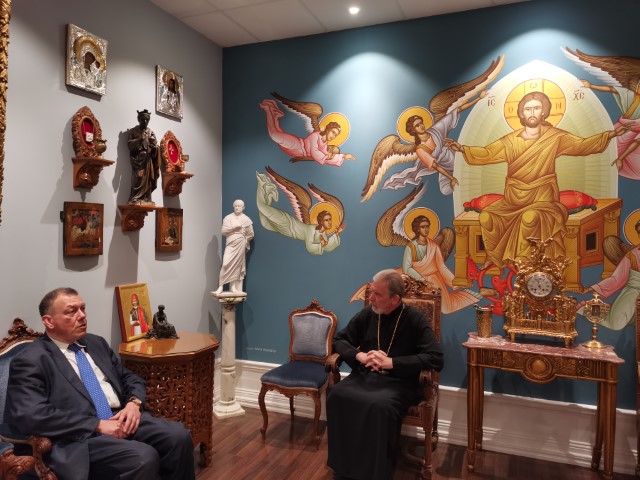 Με αισθήματα χαράς και τιμής, ο Ποιμενάρχης εδέχθη τον κ. Κοτροκόη, τον οποίο ξενάγησε στον αποκατασταθέντα Καθεδρικό Ναό του Αγίου Γεωργίου, στο Μουσείο Ελληνοχριστιανικής Κληρονομιάς, όπου αντάλλαξαν σκέψεις για σύγχρονα ανακύπτοντα θέματα ανά τον κόσμο και στην συνέχεια τον παρουσίασε στα μέλη της νεολαίας.