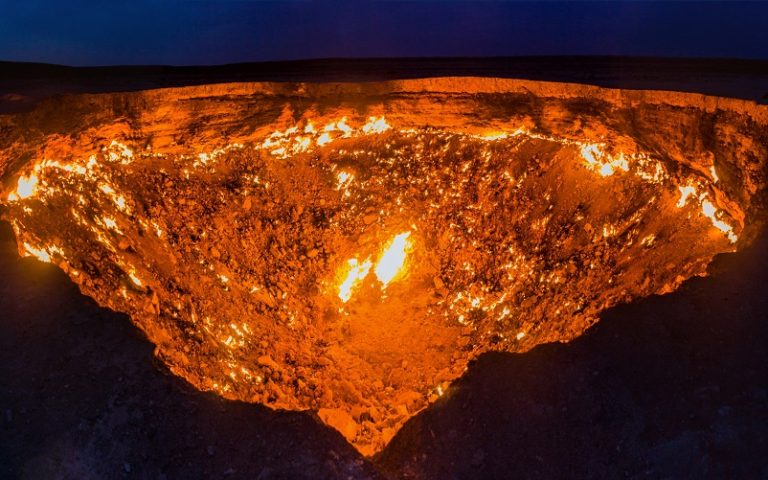 Με διάμετρο 69 μέτρων και βάθος 30 μέτρων, ο κρατήρας Νταρβάζα που βρίσκεται στην μέση της ερήμου Καρακούμ του Τουρκμενιστάν, αποτελεί ένα διάσημο αξιοθέατο, γνωστό ως «οι Πύλες της Κολάσεως».