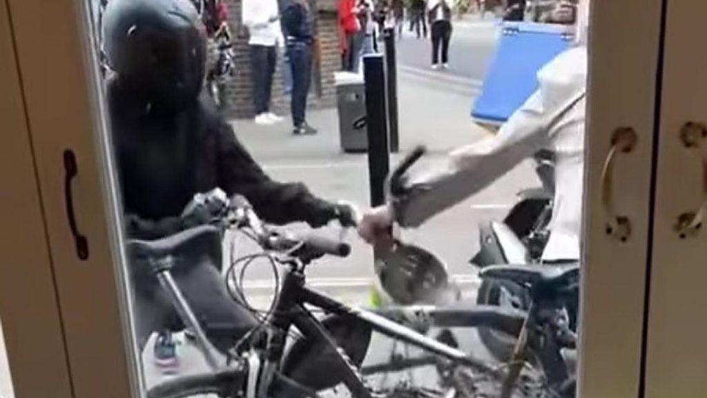 Ετούτη τη φορά στο στόχαστρο της συγκεκριμένης συμμορίας μπήκε ένα ποδήλατο, το οποίο βρισκόταν σταθμευμένο και ασφαλισμένο με αλυσίδα σε πεζοδρόμιο, μπροστά ακριβώς από κατάστημα εστίασης. Το γεγονός αυτό βέβαια δεν εμπόδισε τους ληστές με τα scooters, οι οποίοι σταμάτησαν στο σημείο και ένας από αυτούς χρησιμοποίησε έναν τροχό ώστε να κόψει την αλυσίδα ασφαλείας και να αποσπάσει το ποδήλατο.