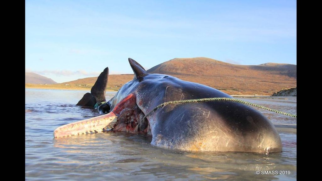 Μέλη της ΜΚΟ «Scottish Marine Animal Stranding Scheme (Smass)», μιας οργάνωσης που ερευνά τους θανάτους δελφινιών και φαλαινών, πραγματοποίησαν νεκροτομή στη φάλαινα για να επιχειρήσουν να διακριβώσουν τα αίτια του θανάτου της.