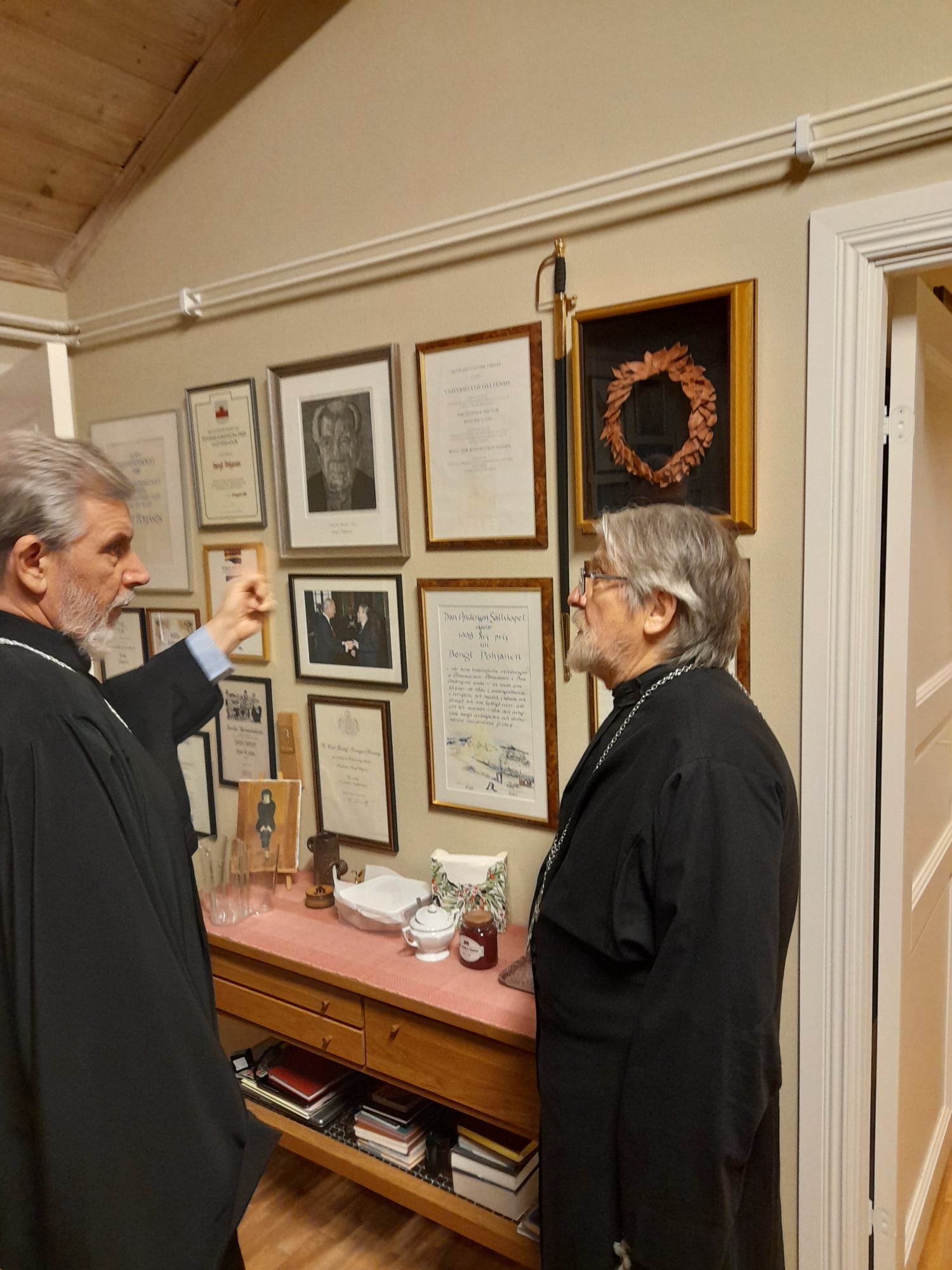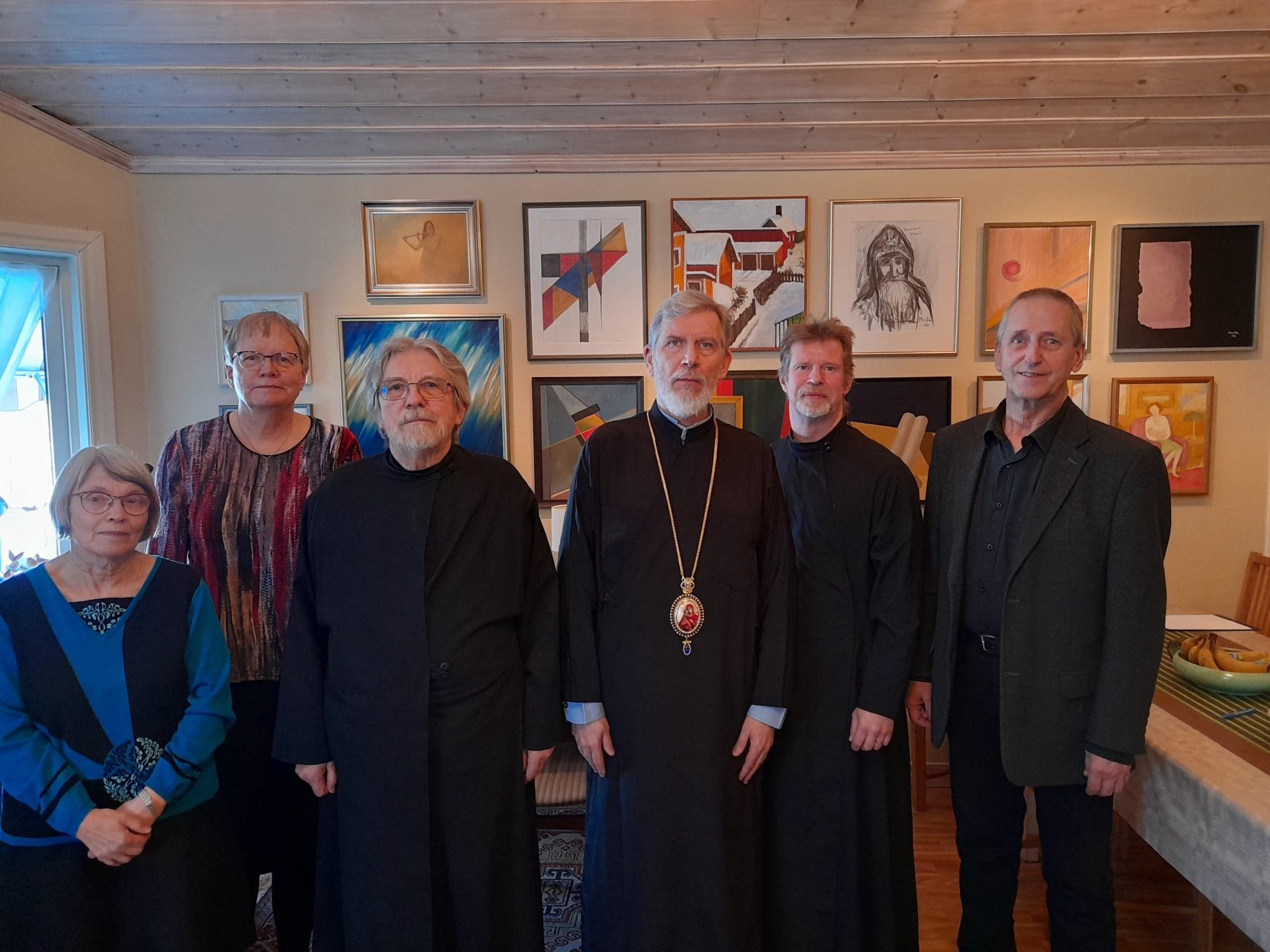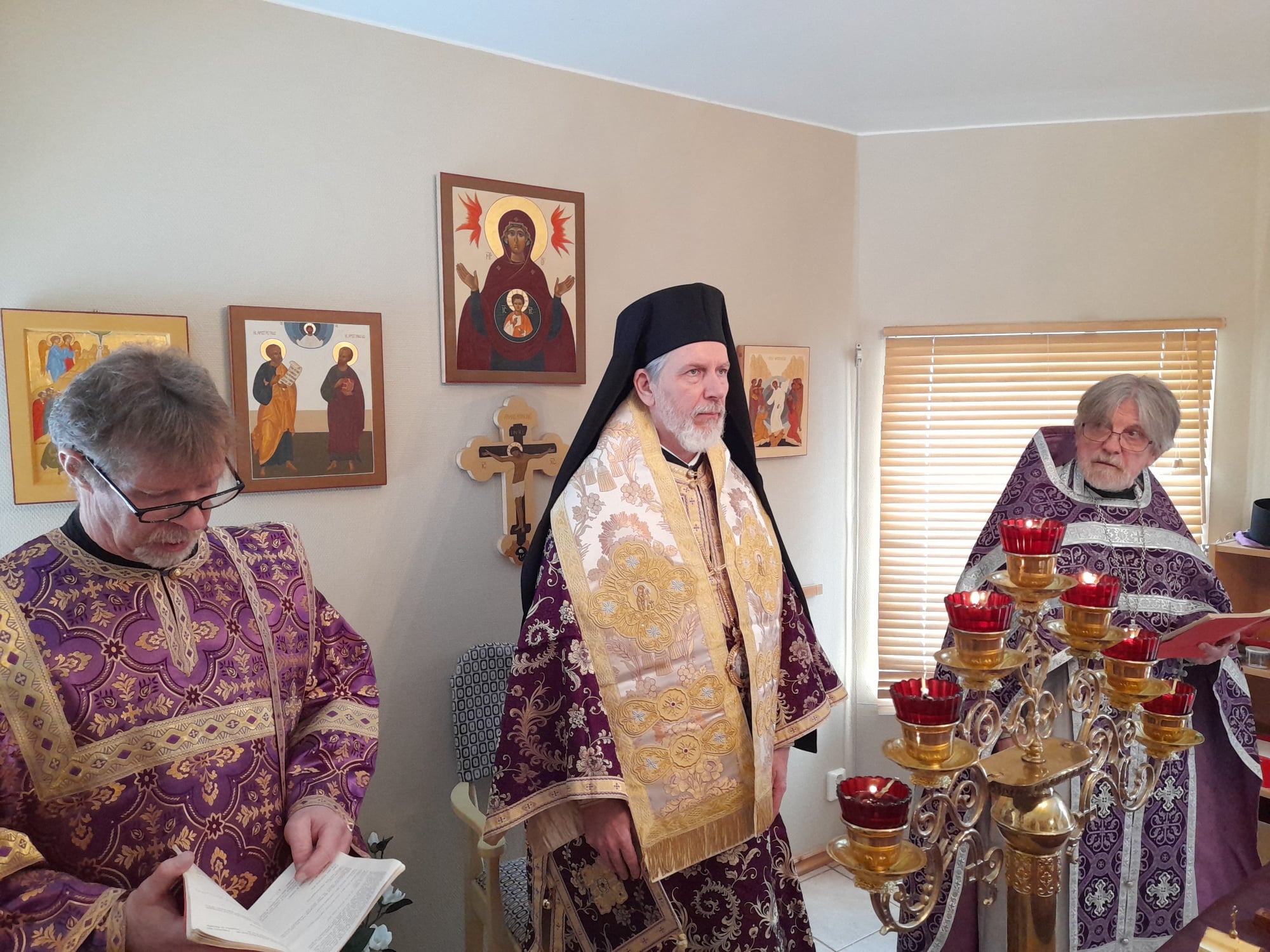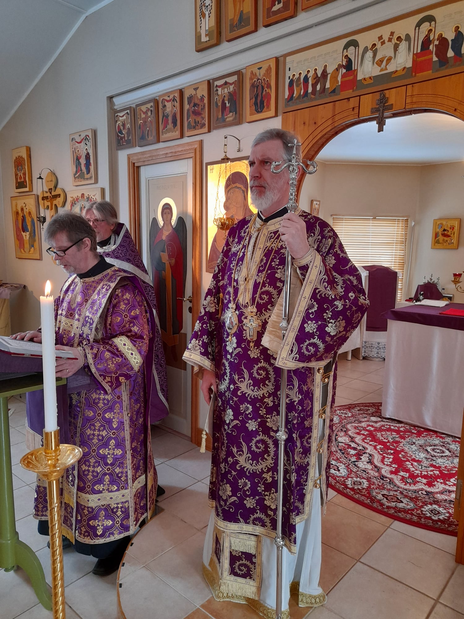 Ακολούθως, ο Σεβασμιώτατος χοροστάτησε στην Ακολουθία του Μικρού Αποδείπνου και στην Β΄ Στάση των Χαιρετισμών στο παρεκκλήσιο της Μεταμορφώσεως, το οποίο κοσμείται από 100 και πλέον φορητές εικόνες, έργα της Πρεσβυτέρας Μόνικας Pohjanen.