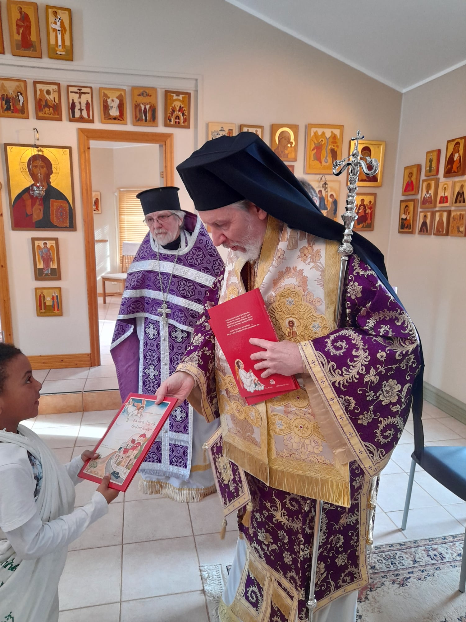 Περατωθείσης της Θείας Λειτουργίας, ο Ποιμενάρχης καθαγίασε τις νέες αγιογραφίες στον τρούλο του παρεκκλησίου και προσέφερε στην κοινότητα τις μελέτες του στην Αγγλική για τον Άγιο Νεκτάριο Πενταπόλεως, και στην Σουηδική την Θεία Λειτουργία, ένα παιδικό βιβλίο, τους Χαιρετισμούς, και τις Αναβάσεις του π. Ευσεβίου Βίττη, προσφορά της Αποστολικής Διακονίας της Εκκλησίας της Ελλάδος και του Γενικού Διευθυντού της, Πανιερ. Μητροπολίτου Φαναρίου κ. Αγαθαγγέλου.