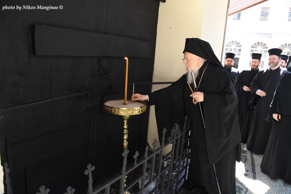 Ο Πατριάρχης, μέσα σε συγκινητική σιωπή, περιστοιχούμενος από τα μέλη της Πατριαρχικής Αυλής, γονυπετής προσευχήθηκε λίγα λεπτά στον ιερό αυτό τόπο για το παρόν και το μέλλον της Μεγάλης του Χριστού Εκκλησίας, για την πνευματική προκοπή του ποιμνίου του, αλλά και για την προστασία της ανθρωπότητας από την πανδημία του Κορονοϊού, ευχόμενος γρήγορα αυτή να λήξει με την εύρεση καταλλήλου φαρμάκου και εμβολίου.