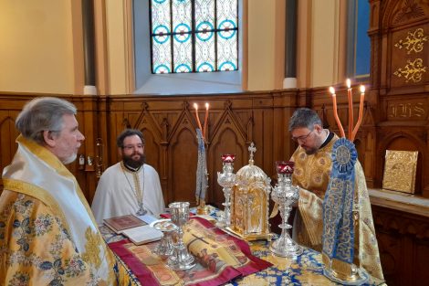 Στο τέλος της Θείας Λειτουργίας, ο Επίσκοπος τέλεσε τρισάγιο υπέρ αναπαύσεως των ψυχών των μακαριστών Πατριάρχου Σερβίας κυρού Ειρηναίου και Μητροπολίτου Λαγκαδά κυρού Ιωάννου.