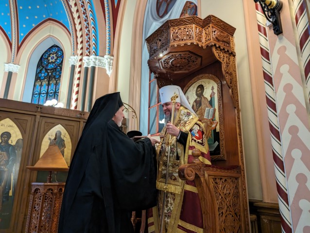Η σημερινή σας παρουσία ανάμεσά μας, Μακαριώτατε, είναι μια ιδιαίτερη ευλογία, καθώς δίδει την ευκαιρία σε όλους μας, να ασπασθούμε την δεξιά σας, να ευλογηθούμε από τον Πρωθιεράρχη της κατά Ουκρανίαν Εκκλησίας, και να θαυμάσουμε τον απλό στους τρόπους και μεγάλο στην ψυχή, τον οιακοστρόφο της Ουκρανικής Εκκλησίας, τον κοσμημένο με υπομονή, νηφαλιότητα και σωφροσύνη, τον άοκνο εργάτη του Ευαγγελίου.