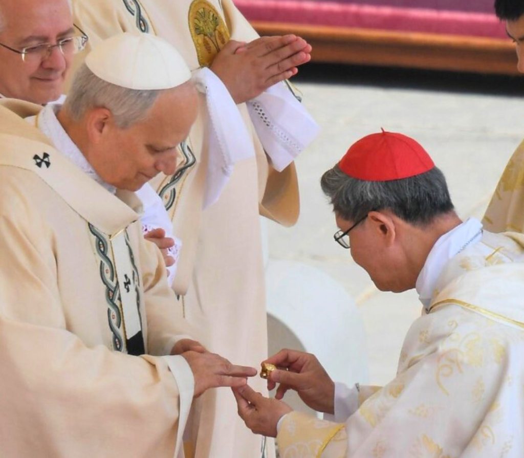 Ο Πάπας Λέων ΙΔ ́ παραλαμβάνει το Δαχτυλίδι του Ψαρά, ή Δακτυλίδι του Πισκατόριου, από τον Καρδινάλιο Λουίς Αντόνιο Ταγκλ, Υπαρχηγός της Δικαστερίας για τον Ευαγγελισμό, κατά τη διάρκεια της Λειτουργίας των Εγκαινίων του Ποντιφικού του στην πλατεία του Αγίου Πέτρου την Κυριακή 18 Μαΐου.