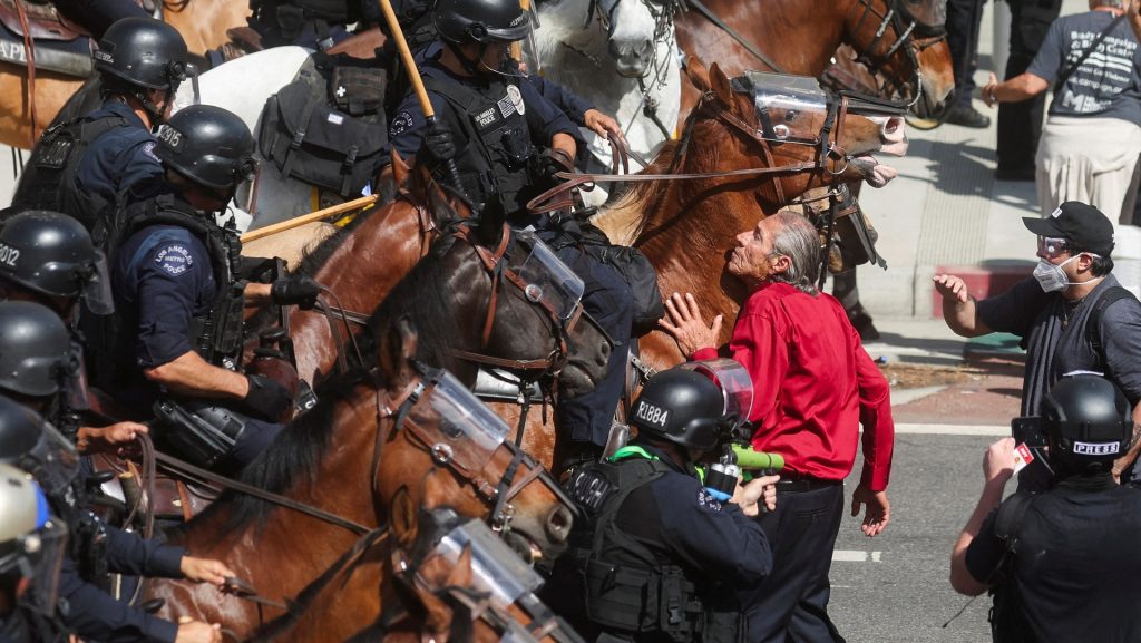 Στο Λος Αντζελες –πρόσφατα θέατρο επεισοδίων, στο πλαίσιο κινητοποιήσεων εναντίον εφόδων για να συλληφθούν παράτυποι μετανάστες, στα οποία ο αρχηγός του κράτους αντέδρασε αναπτύσσοντας χιλιάδες στρατιώτες– σημειώθηκαν μικροεπεισόδια και ρίψεις δακρυγόνων εναντίον «μικρής ομάδας ταραχοποιών», κατά τη διάρκεια διαδήλωσης χιλιάδων ανθρώπων, υπό τα βλέμματα μελών της Εθνοφρουράς που φρουρούσαν κτίρια κι έγιναν στόχος ηχηρών αποδοκιμασιών, χωρίς να αντιδράσουν.