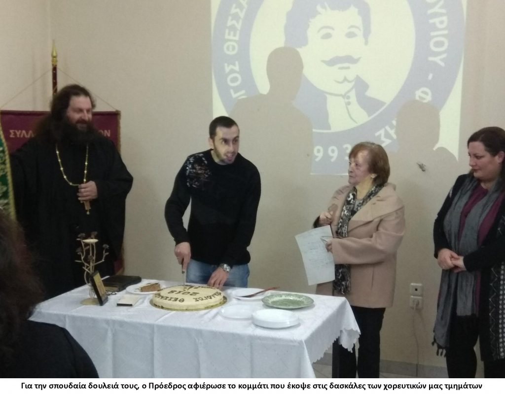 Ακολούθησε η ομιλία του Προέδρου μας κ. Κωνσταντίνου Νταρζάνου ο οποίος ανέφερε: «Αγαπητά μέλη και φίλοι του Συλλόγου, θα ήθελα να σας καλωσορίσω στην αποψινή εκδήλωσή μας και να σας ευχηθώ καλή χρονιά με υγεία. Αρχικά να συστήσω το νέο Διοικητικό Συμβούλιο του Συλλόγου. Η Γενική Γραμματέας κα. Νίκη Πανάγου, η Αντιπρόεδρος κα. Μαρούλα Παναγιωτοπούλου, η υπεύθυνη χορευτικού κα. Βανέσα Ρούντου, ο οργανωτικός γραμματέας κ. Βασίλης Βασιλάρας, το μέλος κ. Βασίλης Ριζούλης και η ταμίας κα. Σταυρούλα Παναγιωτοπούλου. Τα προηγούμενα χρόνια ήταν αρκετά δημιουργικά, αλλά ταυτόχρονα δύσκολα. Η καταστροφική για τον Σύλλογο πλημμύρα, καθώς και οι συνεχείς μας μετακινήσεις έμπαιναν εμπόδιο ώστε να συνεχίσουμε το έργο μας. Τον τελευταίο ενάμιση χρόνο το πρόβλημα της στέγης λύθηκε…τουλάχιστον προσωρινά και μέχρι να γίνει η πλατεία των Θεσσαλών και η στέγη μας. Ένα έργο που θα δώσει μια νέα πνοή στον σύλλογο και στις πλούσιες δράσεις του. Δράσεις που υλοποιούνται σε συνεργασία με τον Δήμο. Στο σημείο αυτό να σας αναφέρω πως εκτός από τα τμήματα παραδοσιακών χορών που έχουν αναλάβει οι κυρίες Δέσποινα Γερμόλα και Άννα Κούβαρη, στον σύλλογό μας λειτουργούν τμήματα πλεκτικής, καθώς και πιλάτες. Τα μαθήματα αυτά είναι δωρεάν και θα ήθελα να ευχαριστήσω τις κυρίες που τα παραδίδουν εθελοντικά. Την κυρία Άννα Κούβαρη και την κυρία Σταυρούλα Παναγιωτοπούλου. Θέλω επίσης να μην παραλείψω να πω για τις προγραμματισμένες μας εκδηλώσεις: την Τσικνοπέμπτη 8/2 στις 7 μ.μ. σας καλούμε εδώ στα γραφεία μας να «τσικνίσουμε» και να γλεντήσουμε! Την Κυριακή 11/02, συμμετέχουμε για 3η χρονιά στο καθιερωμένο πια καρναβάλι του Δήμου μας και με το πέρας του θα έχουμε ένα αποκριάτικο πάρτι στο σύλλογό μας. Όπως και πέρσι, έτσι και φέτος θα έχουμε μια μεγάλη ομάδα η οποία θα συγκεντρώσει χρήματα για τον σύλλογο «ΜΑΖΙ ΓΙΑ ΤΟ ΠΑΙΔΙ» με την συμμετοχή της στο 2ο Φιλανθρωπικό Αγώνα No Finish Line, τρέχοντας ή περπατώντας. Τέλος να σας ενημερώσω ότι ετοιμάζουμε μια μεγάλη εκδήλωση – αφιέρωμα τον Ιούνιο στον Βασίλη Τσιτσάνη και το φθινόπωρο το μεγάλο Αντάμωμα των Θεσσαλών. Χαίρομαι που είμαι Πρόεδρος και συμμετέχω ενεργά σχεδόν σε όλες τις δράσεις του Συλλόγου και καλώ κι εσάς να κάνετε το ίδιο, καθώς πράττοντάς το μόνο να κερδίσετε μπορείτε».