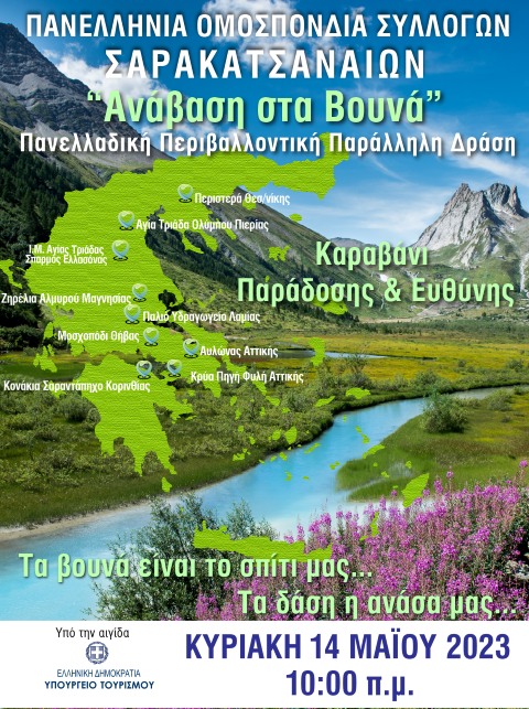 Η Πανελλήνια Ομοσπονδία Συλλόγων Σαρακατσαναίων (Π.Ο.Σ.Σ.) υπό την αιγίδα του Υπουργείου Τουρισμού, διοργανώνει Πανελλαδικά μαζί με τους κατά τόπους συλλόγους, – πιλοτικά για πρώτη φορά- συμβολική ανάβαση στα βουνά ΤΗΝ ΚΥΡΙΑΚΗ 14 ΜΑΙΟΥ 2023 και ώρα 10.00 το πρωί σε διαφορετικές γεωγραφικές περιοχές ταυτόχρονα.