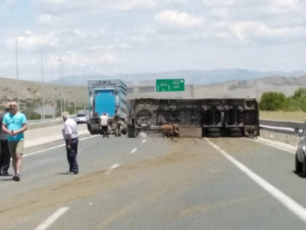 “Έσκασε το λάστιχο της νταλίκας και έφυγε αριστερά στο στηθαιο. Δίπλα ήταν και ένα άλλο φορτηγό αλλά αυτό έμεινε όρθιο. Οι οδηγοί είναι και οι δύο καλά. Μια αγελάδα είναι τραυματισμενη αρκετά. Κάποια άλλα πιο ελαφρά ενώ άλλα ζώα έφυγαν και προσπαθεί η αστυνομία να τα μαζέψει από την Εγνατία. Έτσι έκλεισαν και τα δύο ρεύματα για να μην σημειωθεί νέο τροχαίο από τα ζώα και από τα τσιμέντα που εκσφενδονιστηκαν.”