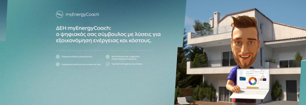 - τον ψηφιακό σύμβουλο ΔΕΗ myEnergyCoach για την παρακολούθηση και αξιολόγηση της κατανάλωσης, τον επιμερισμό της κατανάλωσης στις ηλεκτρικές συσκευές, την αποτύπωση οφέλους ενέργειας και κόστους από την αντικατάσταση ηλεκτρικών συσκευών με σύγχρονες υψηλής ενεργειακής απόδοσης, τη σύγκριση κατανάλωσης καθώς και προσωποποιημένες προτάσεις για την εξοικονόμηση ενέργειας,