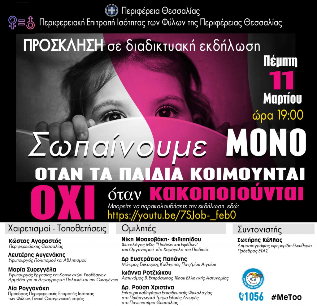 Την Πέμπτη 11 Μαρτίου ώρα 19:00 η Περιφερειακή Επιτροπή Ισότητας των Φύλων της Περιφέρειας Θεσσαλίας, διοργανώνει ανοιχτή διαδικτυακή εκδήλωση υπό την αιγίδα της Περιφέρειας Θεσσαλίας, με θέμα “Σωπαίνουμε όταν τα παιδιά κοιμούνται ΟΧΙ όταν κακοποιούνται”