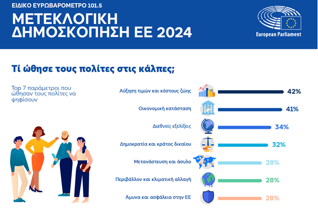 Η αύξηση των τιμών και του κόστους ζωής (42%) και η οικονομική κατάσταση (41%) ήταν οι κύριες παράμετροι για τις αποφάσεις των Ευρωπαίων πολιτών στις ευρωπαϊκές εκλογές του Ιουνίου του τρέχοντος έτους. Τα ποσοστά είναι αισθητά μεγαλύτερα για την Ελλάδα (70% και 69% αντίστοιχα) καθώς και για την Κύπρο (47% και 56%). Το ένα τρίτο των ψηφοφόρων πανευρωπαϊκά (34%) δηλώνουν ότι η διεθνής κατάσταση ήταν ένα θέμα που τους ώθησε να πάνε στην κάλπη, ενώ παρόμοιο ποσοστό αναφέρει ως κίνητρο την υπεράσπιση της δημοκρατίας και του κράτους δικαίου (32%). Στην Ελλάδα, στην τρίτη θέση των θεμάτων που παρότρυναν τους πολίτες να ψηφίσουν (με ποσοστό 40%) βρίσκεται η κοινωνική προστασία, η πρόνοια και η πρόσβαση σε υγειονομική περίθαλψη, ενώ τη διεθνή κατάσταση ανέφερε 37% των ερωτηθέντων. Στην Κύπρο, μεγάλο ρόλο έπαιξαν τα θέματα μετανάστευσης και ασύλου (45%), ενώ η εκπαίδευση βρέθηκε στην τέταρτη θέση της λίστας (26%). Μεταξύ όσων δεν ψήφισαν, οι ερωτηθέντες απάντησαν ότι το κόστος ζωής (46%) και η οικονομική κατάσταση (36%) θα μπορούσαν να λειτουργήσουν ως κίνητρα ώστε να συμμετάσχουν στις εκλογές. Τα αντίστοιχα ποσοστά στην Κύπρο είναι 53% και 42% (με τα θέματα μετανάστευσης να καταλαμβάνουν τη δεύτερη θέση με 45%) και στην Ελλάδα 65% και 58%, με τρίτη την κοινωνική προστασία, την πρόνοια και την υγειονομική περίθαλψη (40%).