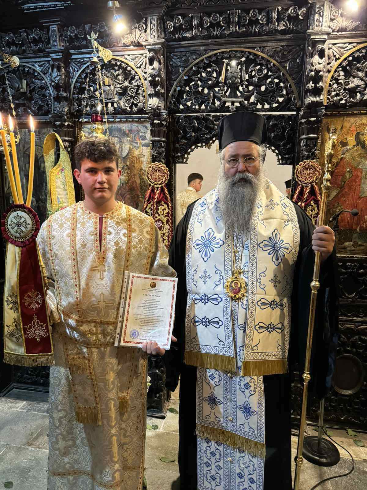 Μετά το πέρας του Εσπερινού, ο Σεβασμιώτατος Μητροπολίτης κ. Γεώργιος χειροθέτησε τον Διακονητή Αναστάσιο Κατσαμάγκα, μαθητή Γ΄ Λυκείου, οποίος διακονεί τόσο στην Ενορία Ράχης, όπου διαμένει, όσο και στην Ιερά Μονή Πέτρας.