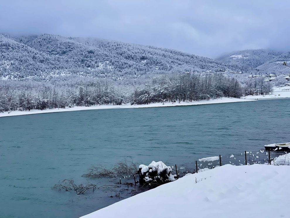 Λευκό πέπλο, πρώτη φορά για φέτος, και στη λίμνη Πλαστήρα.