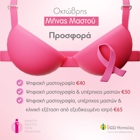 Το Κέντρο Μαστού του ΙΑΣΩ Θεσσαλίας, όπως κάθε Οκτώβριο, γιορτάζει το Μήνα Ευαισθητοποίησης για τον Καρκίνο του Μαστού με μοναδικά πακέτα προληπτικών εξετάσεων σε προνομιακές τιμές.