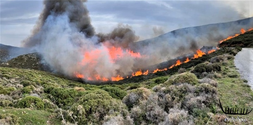 Οι ισχυροί άνεμοι, εντάσεως 7 μποφόρ, δυσχεραίνουν το έργο των πυροσβεστών στην Άνδρο, οι οποίοι δίνουν μάχη προκειμένου να θέσουν υπό έλεγχο την πυρκαγιά που είναι σε εξέλιξη στην περιοχή Ρέματα.