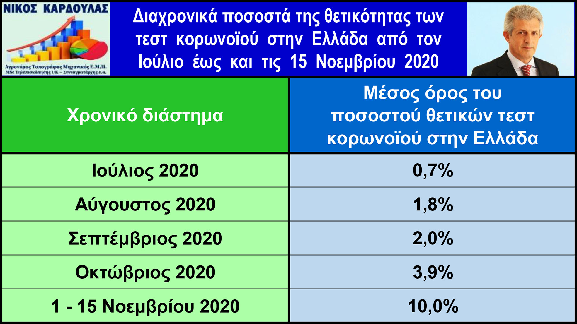 Στον παρακάτω πίνακα φαίνονται οι μέσοι όροι των ποσοστών των θετικών τεστ που καταγράφηκαν στην Ελλάδα από τον Ιούλιο μέχρι και τις 15 Νοεμβρίου 2020.